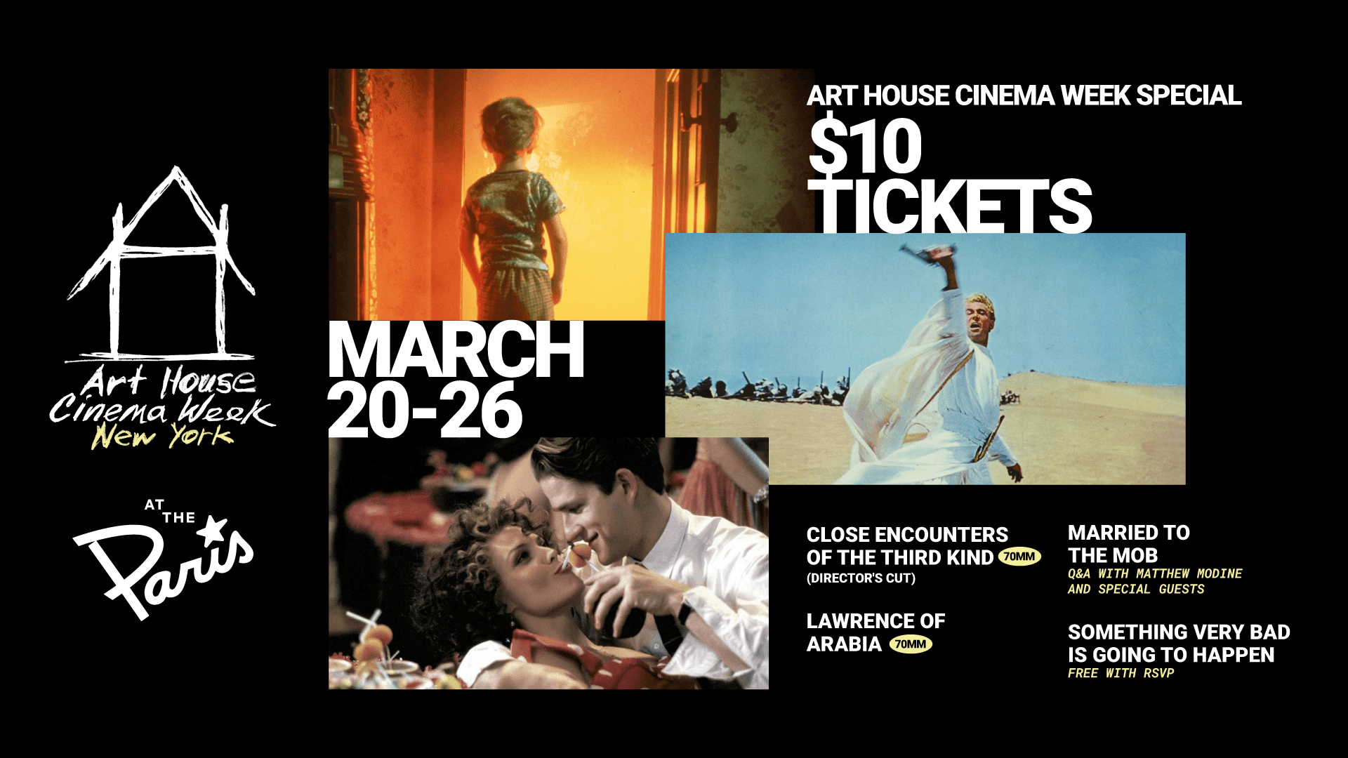 The Paris Theater will be screening its own 70mm prints of Close Encounters of the Third Kind (Director's Cut) and Lawrence of Arabia, plus a screening of Jonathan Demme’s Married to the Mob (also screening as part of New York Film Critics Circle at the Paris) followed by a post-screening conversation with actor Matthew Modine and additional special guests. Special Cinema Week $10 general admission pricing for all seats at these featured screenings.